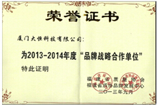 厦门大恒2013-2014年度“品牌战略合作单位”荣誉证书