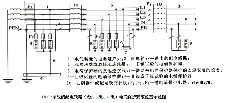 TN-C-S系统的配电线路(I级、II级、III级)电涌保护安装位置示意图