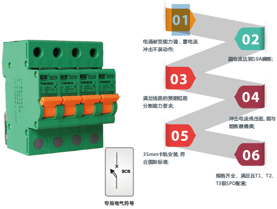 SCB保护器:或称SPD专用后备保护器,解决防雷器因劣化和电网故障引起的火灾。解决了因雷电引起的后备保护装置误动作造成的防雷器失效问题。确保SPD不起火、使设备防雷持续有效、解决目前广泛使用断路器或熔断器做外置脱离器存在的保护盲区问题,是光伏供电系统SPD理想的防火配套器件。