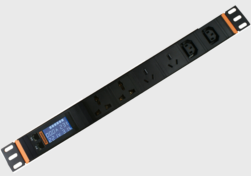PDU外置传感器多点监测—专利设计 1. RS485、RJ45网络接口二合一,可实时传送监测信息。 2. 当前使用电流、系统电压、环境温度、环境湿度,高精度实时监测。 3. 可根据客户需求可对整体机房PDU进行联网,总控机房实时监测机柜状态。 4. LCD智能检测模块融合了大屏幕、检测精度高、数据显示直观,数据实时传输,多台共网链接等独特功能。 5. 使用可分离式外置温度,温度传感器可对机柜内不同区域进行监测,实现环境监控无盲区,监控数据实时可靠。