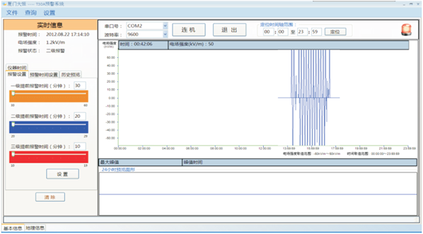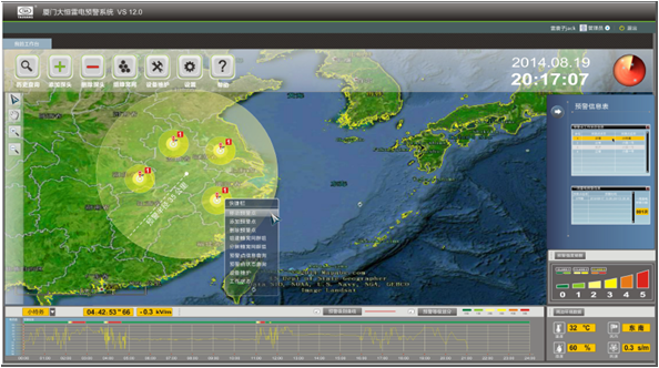 大恒T30A雷电预警系统主要包括地理信息监控、雷电报警信息查询、雷电预警设置、历史数据查询,时间管理等功能。