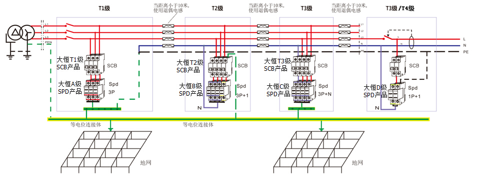 依据IEC61643防雷规范要求及IEC1312防雷及过电压规范,对电源供电系统实施三级保护,以分流的方式达到各个线路等电位的要求。对于实施三级防雷是因为能量需要逐级泄放,传输线路会感应雷击电磁脉冲辐射(LEMP),对于拥有信息系统的建筑物,三级防雷成本相对较低,保护较为充分的原因而选择三级防雷。